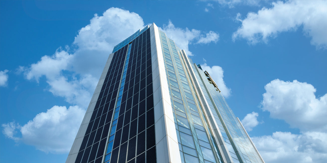 Rivestimento esterno dei pilastri realizzato con circa 2500 mq di pannello Doluflex sp. 25 mm tipologia 10-3-8 ap. con finitura in alluminio anodizzato argento naturale 20 micron.